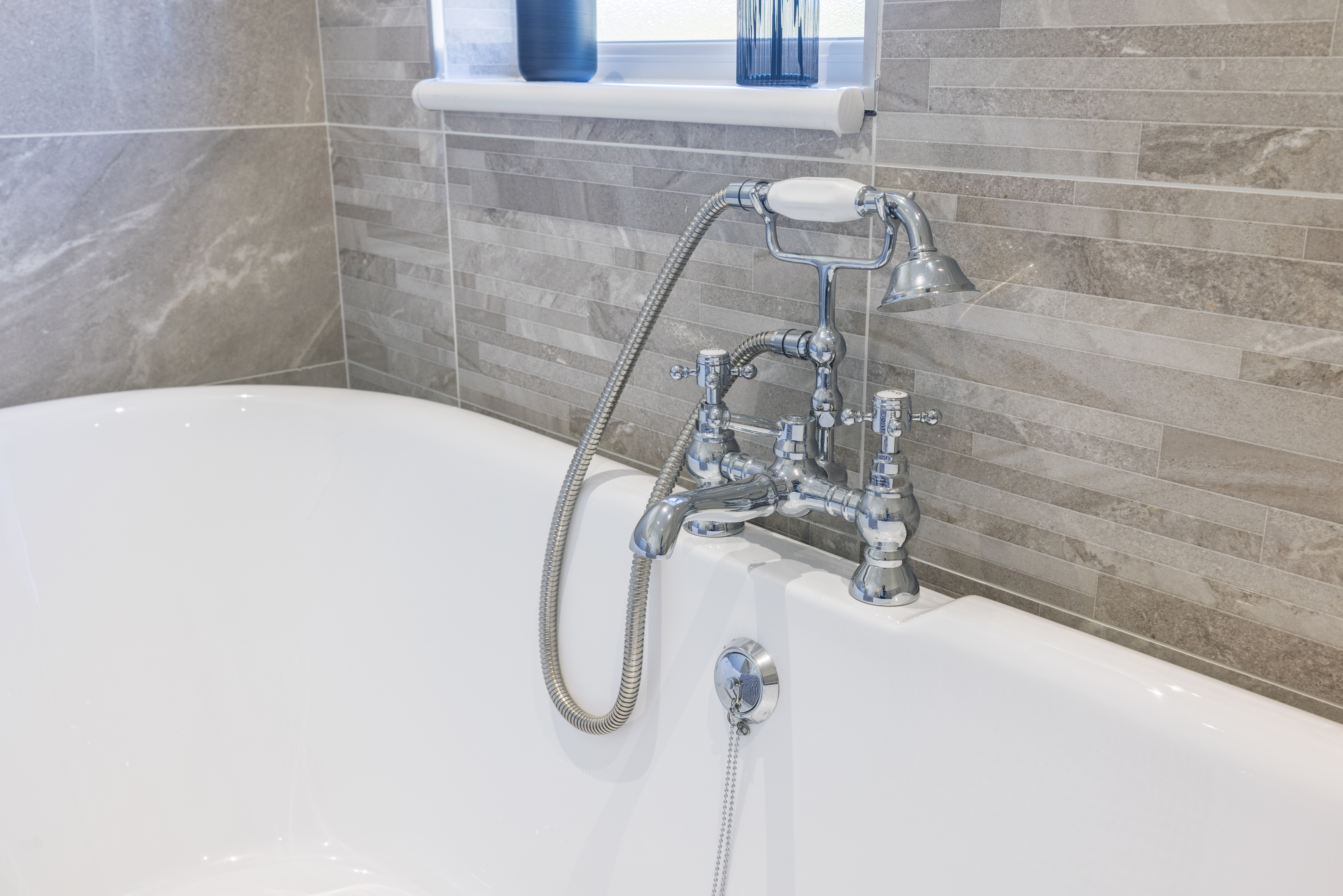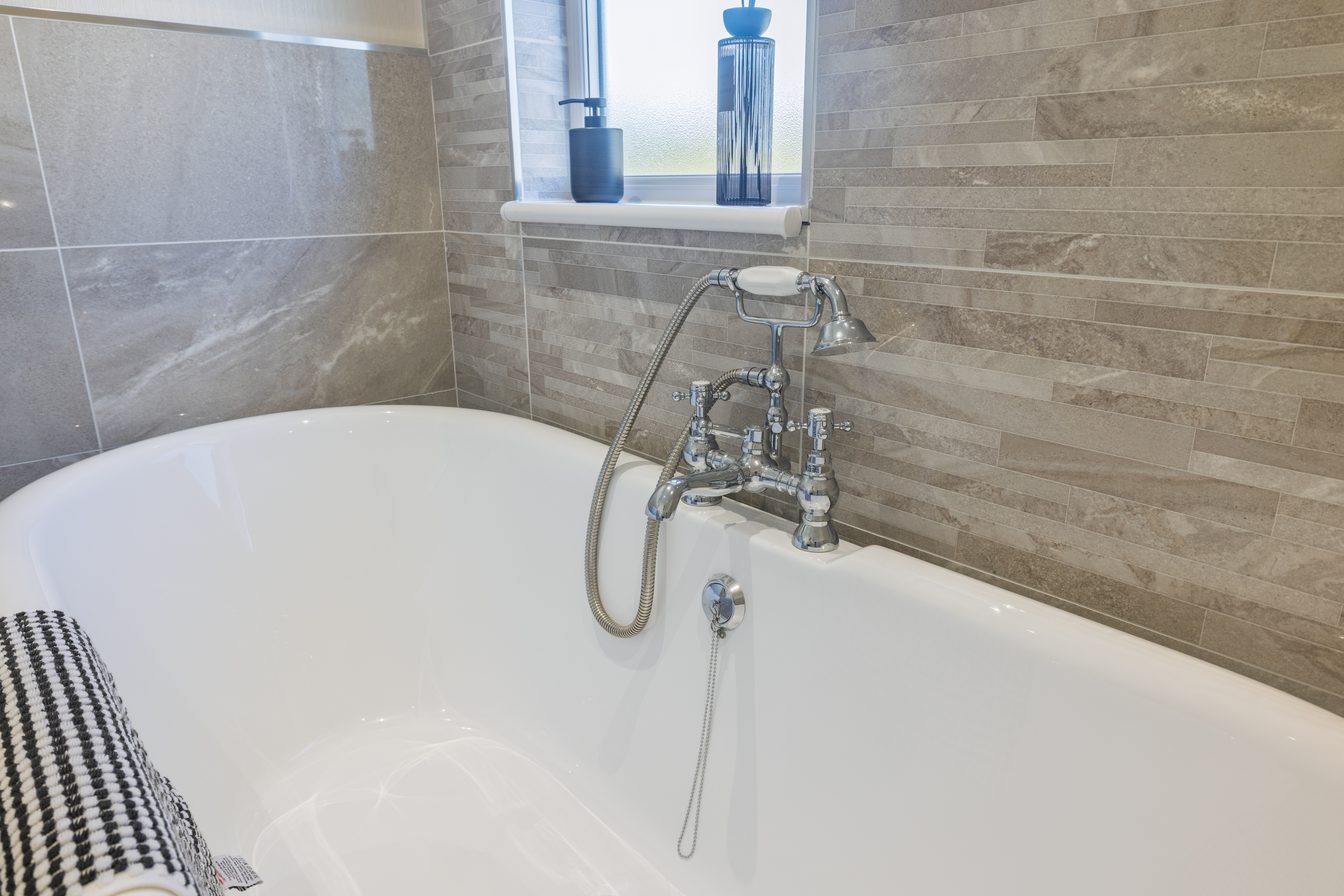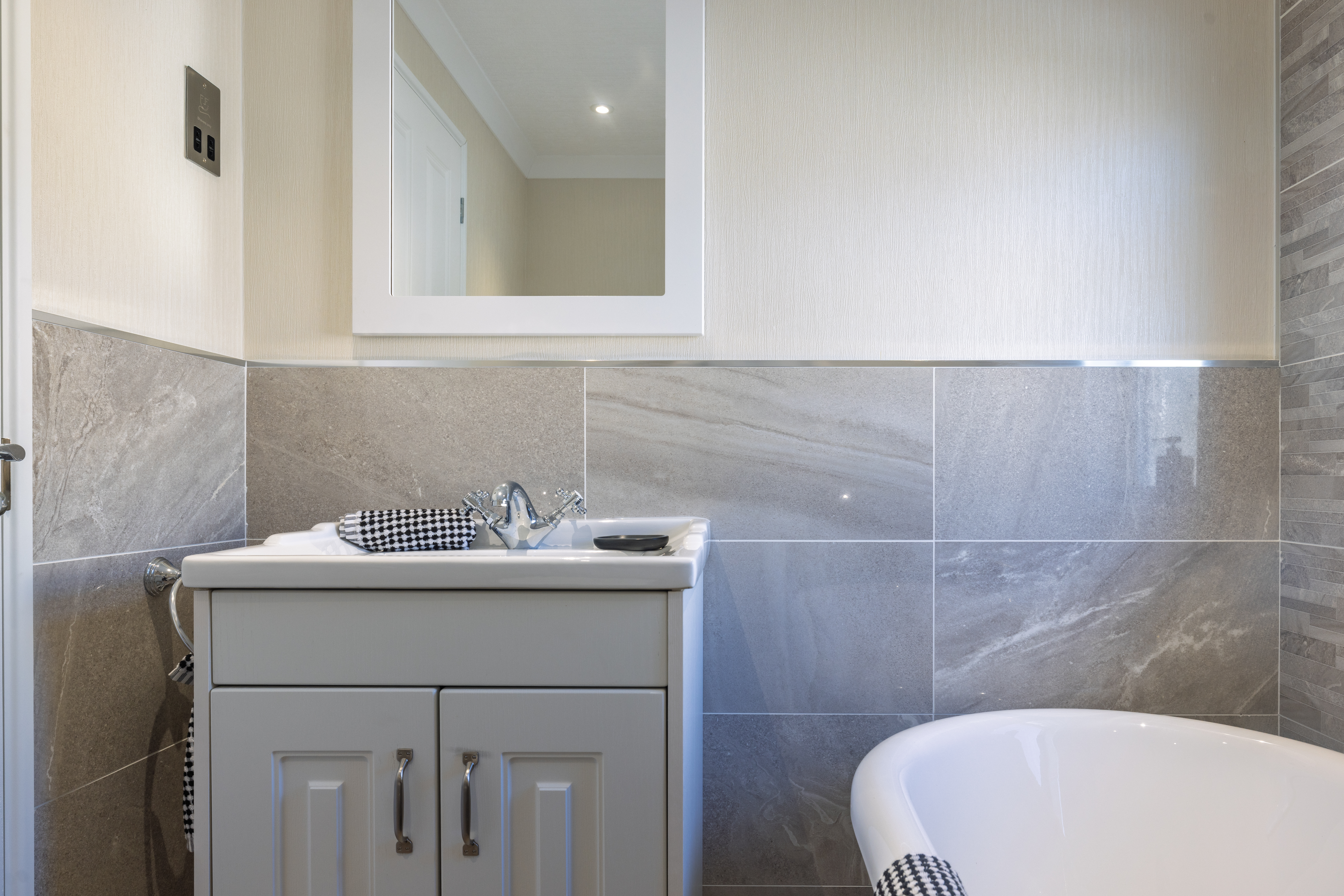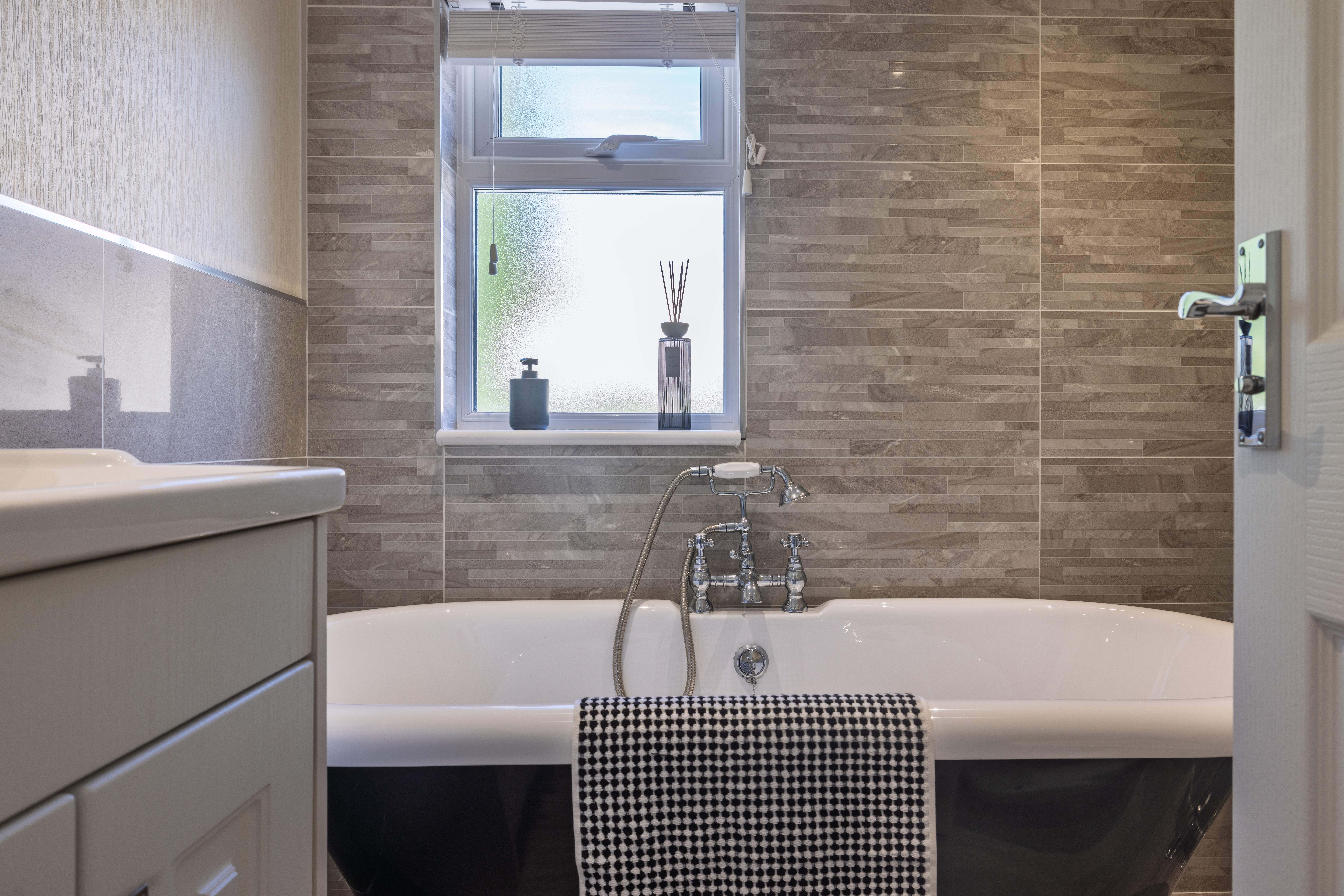 An inner hallway leads to two double bedrooms, both with fitted storage. The principal bedroom benefits from a walk-in wardrobe and en-suite, while the family bathroom includes a freestanding bath and heated towel rail.